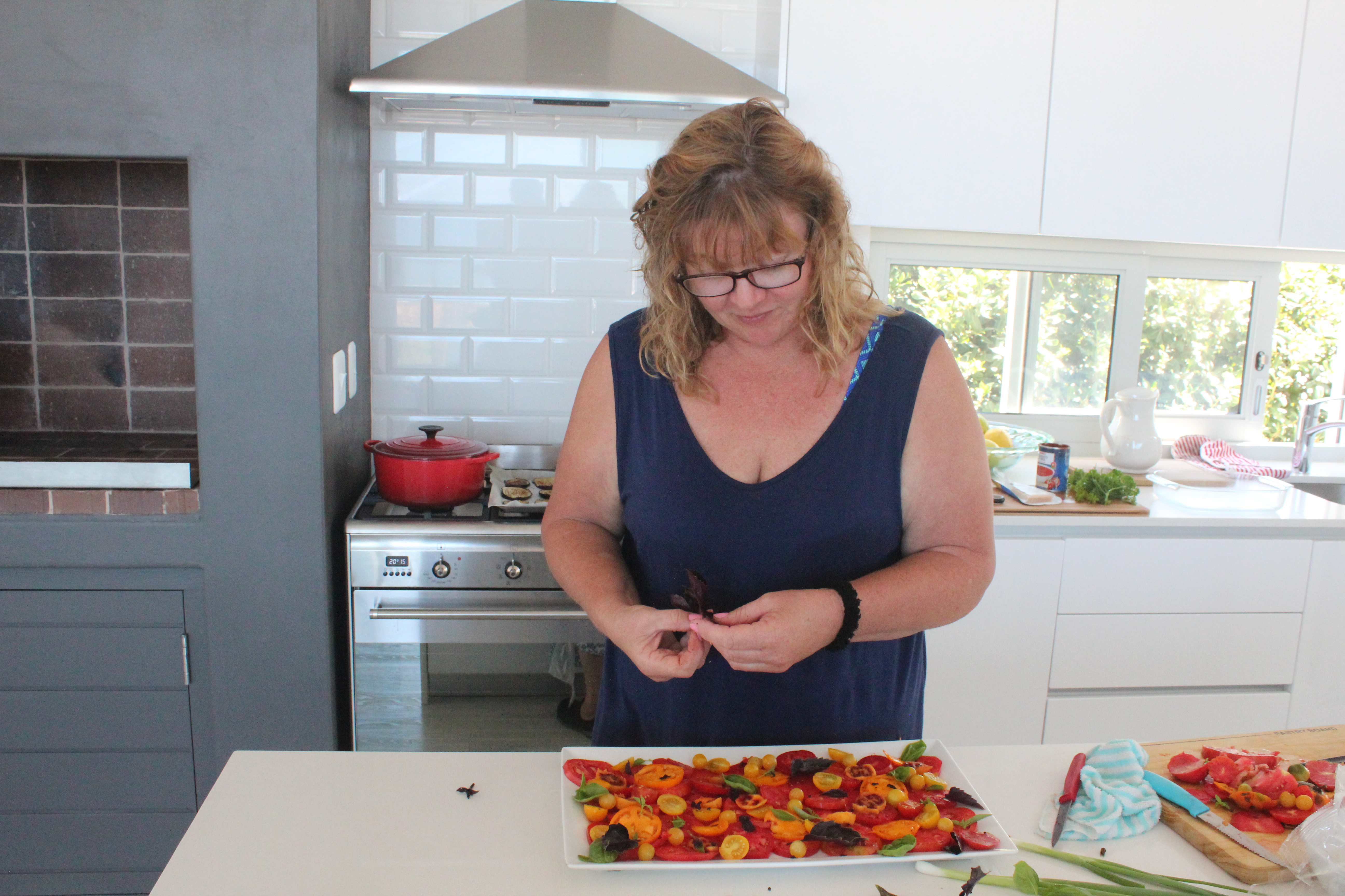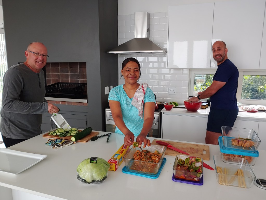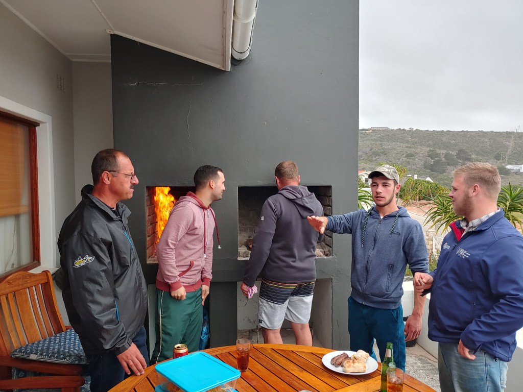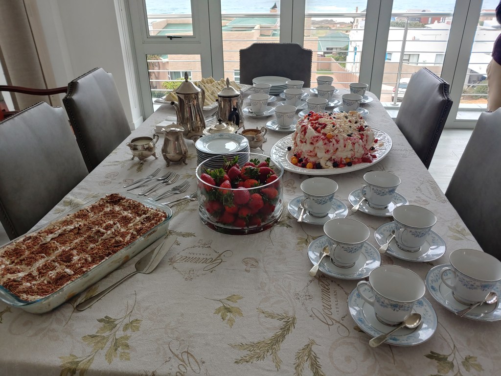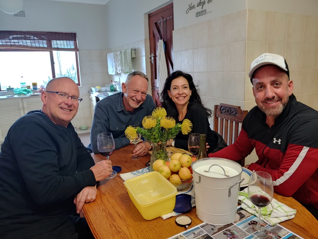Nou gaan Kulula EERS voluit en die George lughawe roer. Die N2 is net so bedrywig uit die Boland. Dis Maart, dis herfs en dis groot kuiertyd. ‘n Grand finale van die sabbatsjaar. Tanya en Chris het afgevlieg met tasse vol goeters uit hulle tuin en vele flesse en bottels. Vandag kook ons saam uit drie tuine van Kayalami, Stilbaai tot Jongens, en uit twee kombuise. Dis klein swart vye en tamaties van elke moontlike kleur en grootte en mozerella en basilie, net soos ons dit twee jaar gelede in Provance gedoen het Louise, en spinasie en eiervrug, salie en wilde knoffel blomme wat in ‘n slap degie in olyfolie gebraai word, boomtamaties uit Gerrie se tuin, brood uit Daleen se oond, en die filet is uit die oond en toegedraai in hande vol gekapte kruie. Dis ‘n beeldskone mooi dag, die seewater is glad en lou. Ons kuier onder die boom. Die week is korrelkonfyt en druiwe en appelblatjang ingelê. Gertie het kom help skil en prut en tussendeur het Karolien af in die straat kom help seker maak dat hierdie sabbatstories en saamkuierkiekies vir ewig onthou sal word, daaroor meer ‘n ander dag. Ons stap ons swem ons lapskyt ons kuier onder baie melkhoutbome, en o ja natuurlik onder die peperboom by Inverroche. Hier is nog oop stoele onder die melkhoutboom, kom kuier saam.